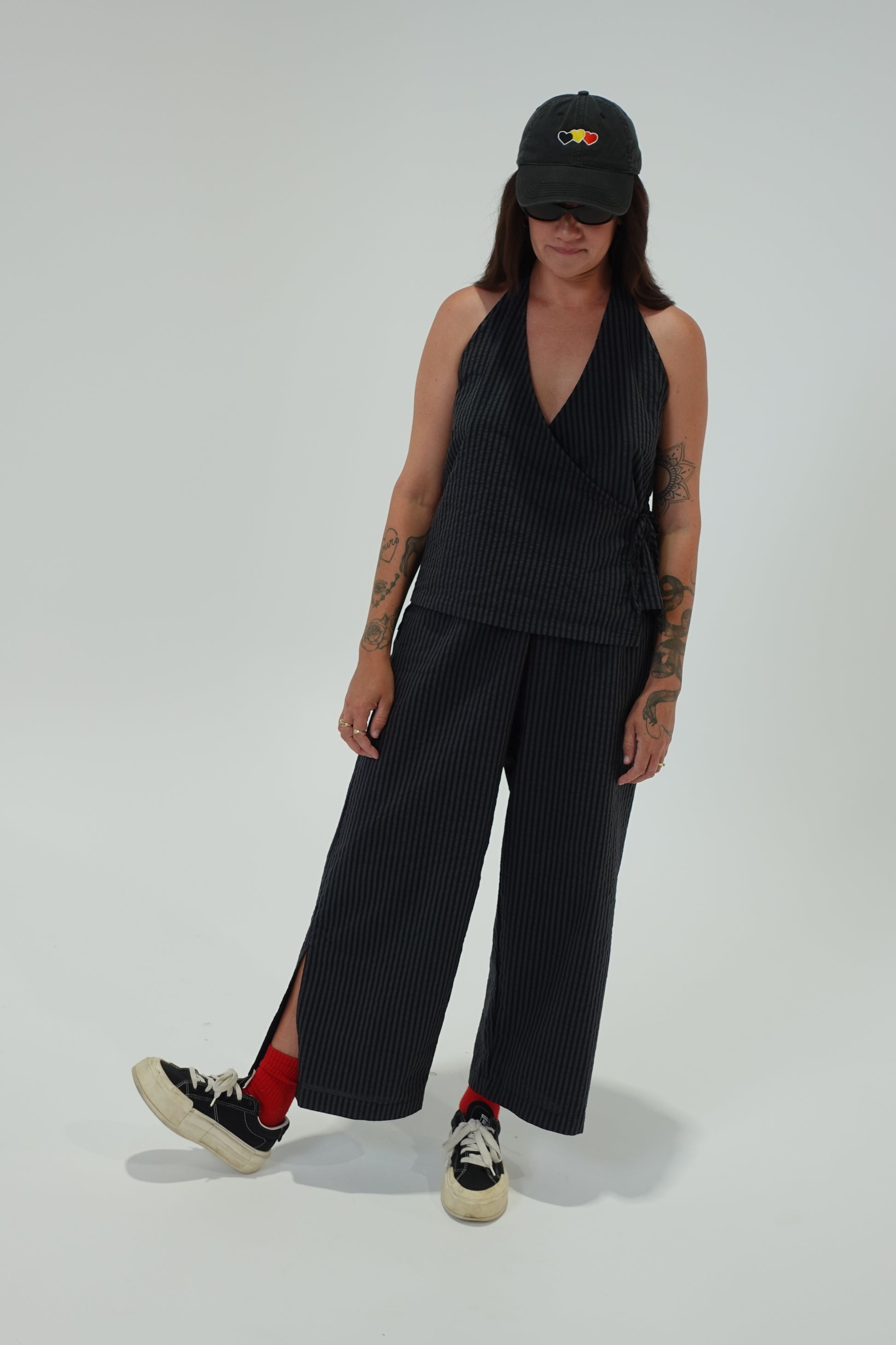 These wide-legged pants with a spilt split hem are crafted from the same cotton the matching wrap top. They flow beautifully for a relaxed yet polished look—perfect for making a statement whether you dress them up or keep it casual.