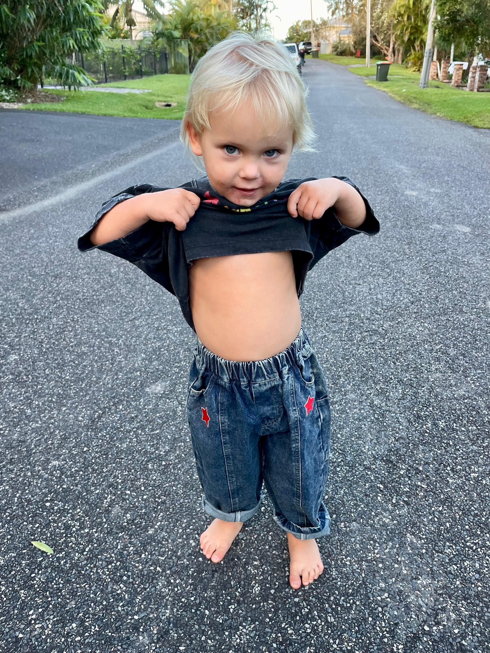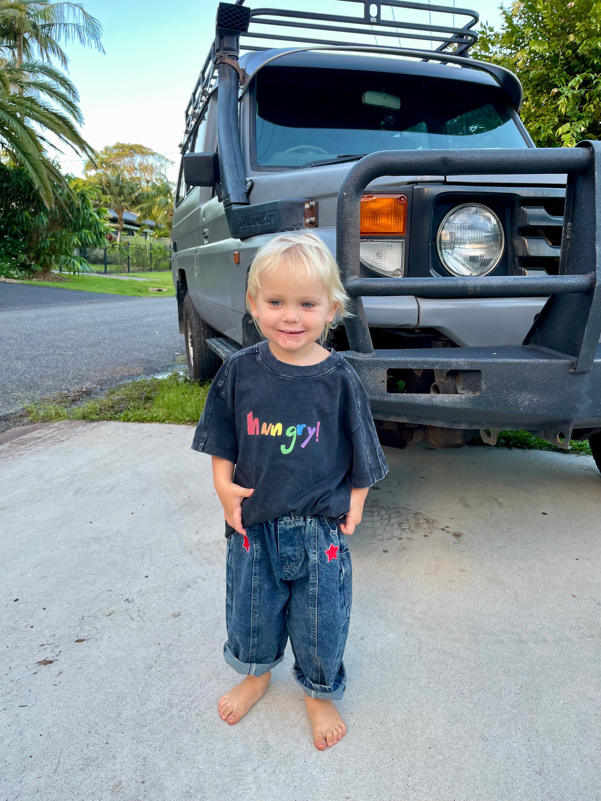 A bold felled seam running down the leg for extra durability - because we know kids are experts at turning clothing into adventure gear. Plus, playful red embroidered star patches.