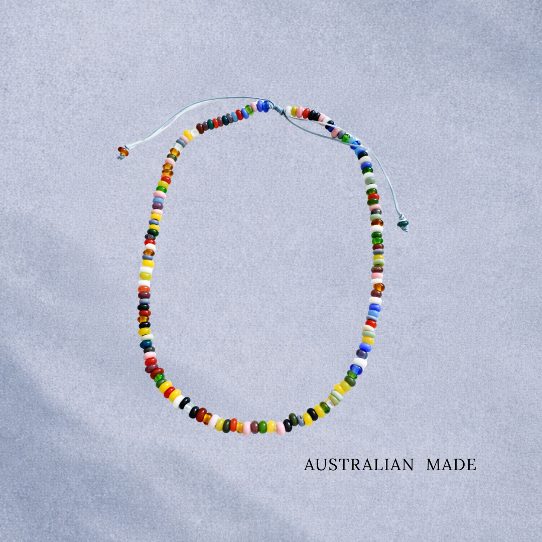 Playful, vibrant and effortlessly wearable — Solara is a celebration of colour and craft. Featuring a thoughtfully mixed sequence of glass beads in bold brights and soft pastels, each necklace is individually strung to create a perfectly imperfect rhythm of tone and texture.